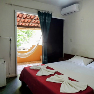 1 cama de casal (ou 2 solteiros) Quarto confortável com ar condicionado split, TV LCD , frigobar, banheiro (box blindex, chuveiro quente) e varanda privativa.
